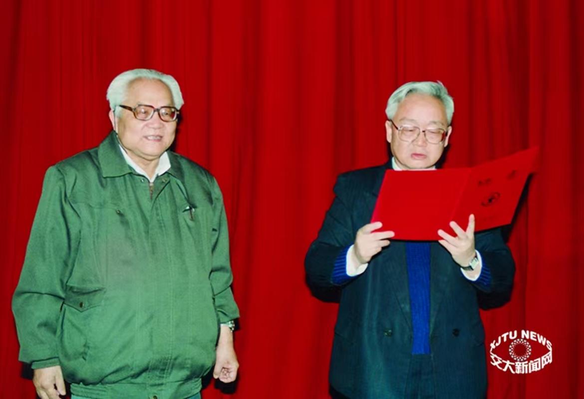 吴文俊(左)1997年4月受聘为西安交通大学名誉教授,时任西安交通大学校长蒋德明(右)为吴文俊颁发聘书